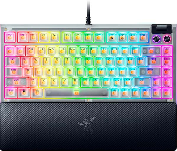 Ratón gaming de precisión con carcasa traslúcida, 12 zonas de iluminación Chroma RGB y diseño ergonómico pensado para sesiones competitivas.Razer BlackWidow V4 75% – Phantom White Edition