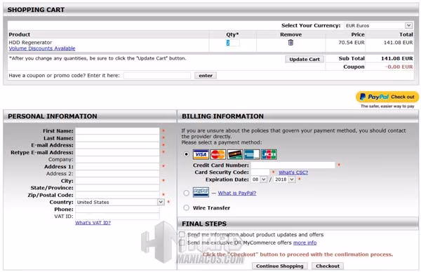 Para comprar HDD Regenerator, deberemos pulsar en “Full Version” y luego en “Buy Online”, donde nos irá al navegador para realizar la compra de HDD Regenerator, pudiendo pagarla por PayPal o tarjeta de crédito.