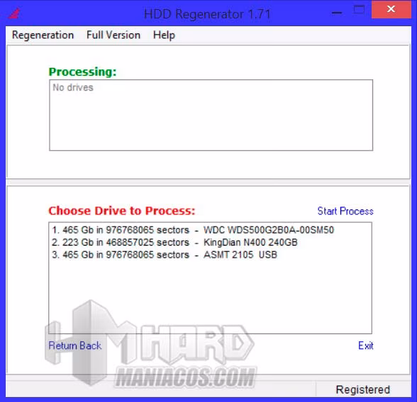 Después, nos saldrán los discos duros que tenemos conectados en el ordenador, seleccionamos el que queramos reparar con HDD Regenerator y pulsamos en “Start Process”.