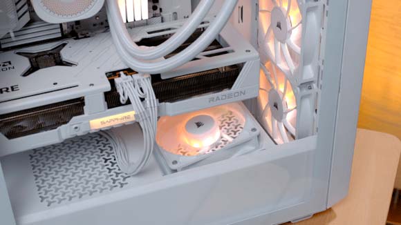 Uno de los detalles más interesantes del diseño es la incorporación de un soporte de ventilador en ángulo en la parte inferior, pensado específicamente para dirigir aire frío hacia la GPU. Este enfoque ataca directamente uno de los puntos más críticos en cualquier sistema moderno: la temperatura de la gráfica bajo carga.