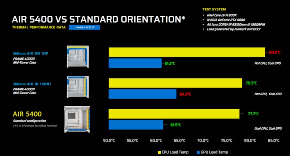 Ganador de múltiples premios en Computex 2025, el AIR 5400 introduce un diseño que separa CPU, GPU y fuente de alimentación en cámaras independientes. La tercera cámara está especialmente diseñada para un sistema de refrigeración líquida AIO de 360 mm, que se monta en la parte frontal para recibir aire fresco directamente del exterior.