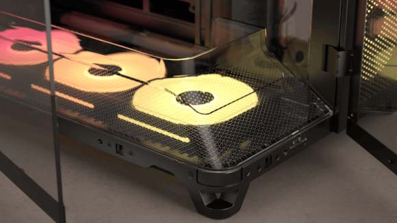 El panel superior de E/S incluye tres puertos USB Type-C (dos a 5 Gb/s y uno a 10 Gb/s), además de conector combinado de audio, botón de encendido y brazo antidescolgamiento para GPU. También se incluyen tornillos QuikTurn®, una caja de almacenamiento reutilizable y un paño de microfibra para mantener el vidrio siempre reluciente.