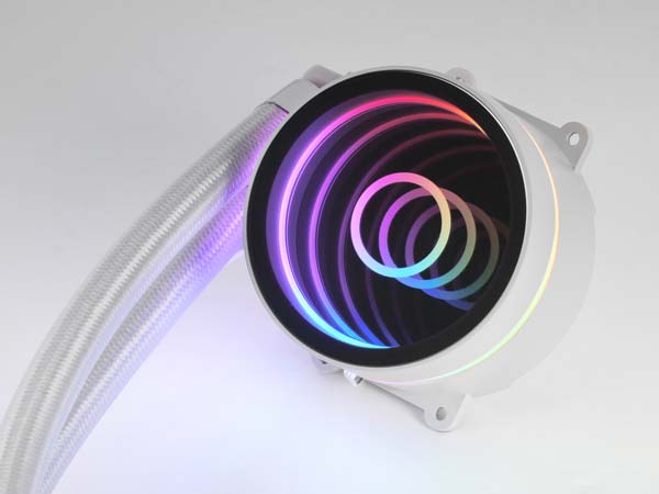 Si nos entramos en la iluminación FRGB, vemos como tiene en la bomba, un espejo multicapa con iluminación FRGB. El cual, nos da un efecto de profundidad infinito muy llamativo. A esto hay que sumarle, la propia iluminación FRGB de 360 grados que nos da el ventilador del radiador.