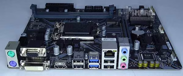 Si vemos el backplate, comprobamos que tiene, de izquierda a derecha: 2 puertos PS/2 para teclado y ratón, puerto VGA, DVI y HDMI para salida de vídeo, 2 USB 2.0, 2 USB 3.1, conector RJ45, otros 2 USB 2.0 y los puertos de sonido.