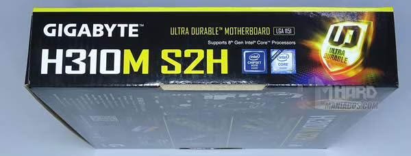 Viendo externamente la caja, tenemos en el frontal de la misma, las letras en grande del modelo, junto a la compatibilidad con procesadores Intel de 8ª y 9ª generación y el socket LGA 1151. Encima de esto, vemos el logo de Gigabyte, así como una insignia de ULTRA DURABLE en grande.