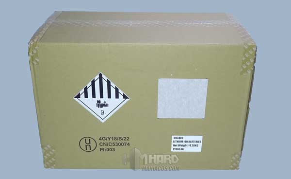 Comenzamos viendo el exterior de la caja, la cual tiene las letras de EcoFlow en los lados, así como alguna información relativa a que contiene baterías, peso del mismo y modelo.