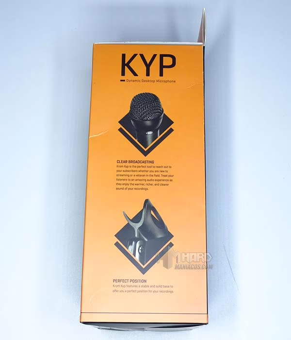 El micrófono Krom KYP viene dentro de una caja pequeña de cartón, donde podemos ver en el frontal el logo con el nombre de la marca, una imagen del propio micrófono en la base que también incorpora y en la parte de abajo, el nombre junto a un breve texto en inglés.