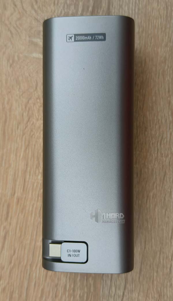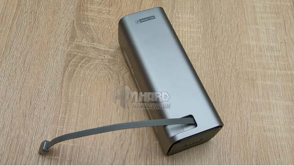 En el lateral opuesto a la pantalla, encontramos un conector USB-C con cable, el cual, si lo estiramos, vemos que tiene una buena longitud de 60cm. Este cable nos servirá para cargar los dispositivos que necesitemos y también para recargar el power bank, evitando tener que llevar con nosotros un cable. Además, aquí también se nos indica la capacidad de esta unidad y la posibilidad de llevarla en aviones.