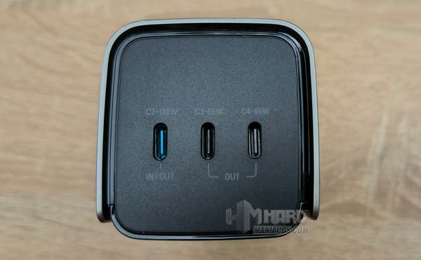 Si nos fijamos en el lado corto de la parte superior, encontramos 3 puertos USB-C, los 3 permiten la recarga de dispositivos a diferentes potencias que nos vienen indicadas en cada uno, pero uno de ellos también nos servirá para cargar la unidad, el que está marcado con un color azul en el interior.