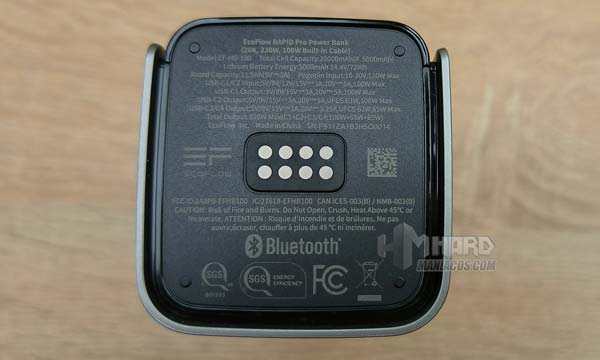 Si le damos la vuelta, vemos en el centro un puerto de conexiones para usarlo con el cargador de escritorio de la marca; además de encontrar las especificaciones de los puertos de carga, el indicativo de la conectividad Bluetooth y algunos sellos.