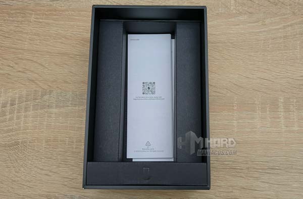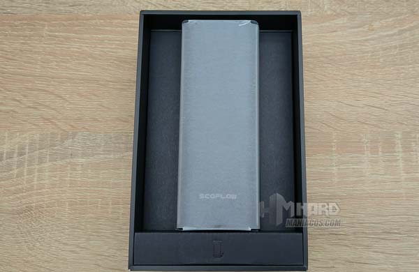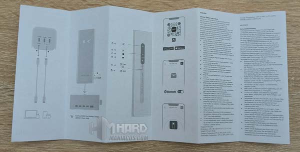 Abrimos la caja y nos encontramos, en primer plano, con la batería RAPID Pro perfectamente protegida por un papel protector. Debajo del power bank, tenemos un pequeño manual de instrucciones y, a sus pies, hay una pequeña caja que contiene una bolsa para su transporte.