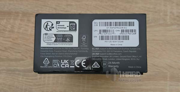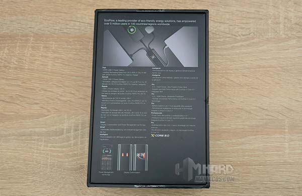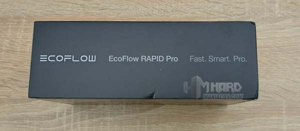 El EcoFlow RAPID Pro viene dentro de una caja de cartón de pequeño tamaño, en la que podemos ver, en primer plano, una foto del power bank con unas indicaciones en la pantalla y las letras de EcoFlow encima de esta. Además, se nos indica que es apta para usar en aviones, las diferentes potencias, conectores con los que cuenta, y la longitud del cable que trae.