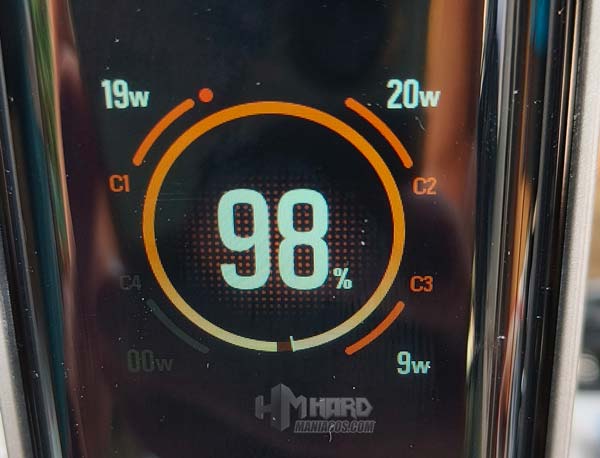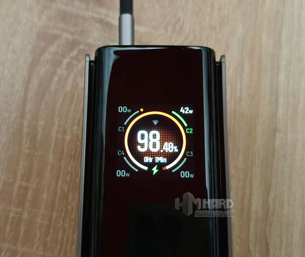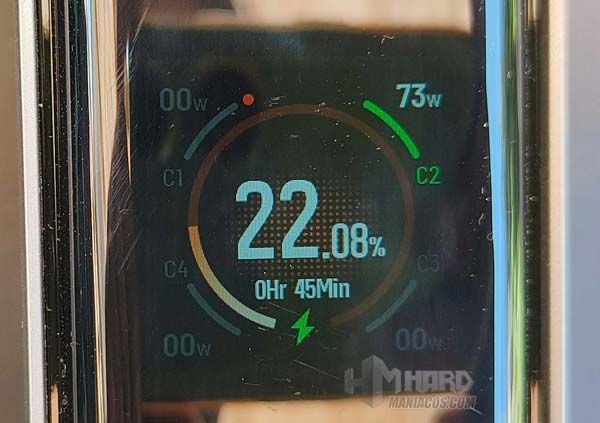 Ahora pasamos a encender la unidad, para ver el estado de carga que tiene y proceder a realizar diferentes pruebas. En nuestro caso, nos indicaba que tenía un 50% de carga. Esta primera carga, se realizó en aproximadamente 1 hora usando, para ello, el cargador de 140W RAPID Pro, junto al cable de 240W. En todo momento se nos muestra el tiempo que falta para finalizar la carga.