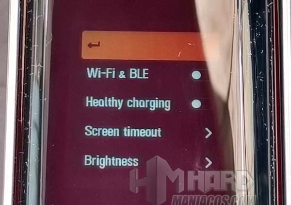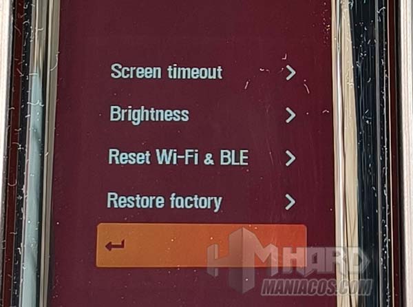 Después de finalizar la carga, nos pusimos a configurar la unidad. Para ello, deberemos pulsar en el botón lateral que tiene un punto e ir navegando con las flechas hasta la opción de Settings, donde le daremos otra pulsación al botón con el punto. En estas opciones, iremos al apartado de Wifi y BLE y lo activamos.