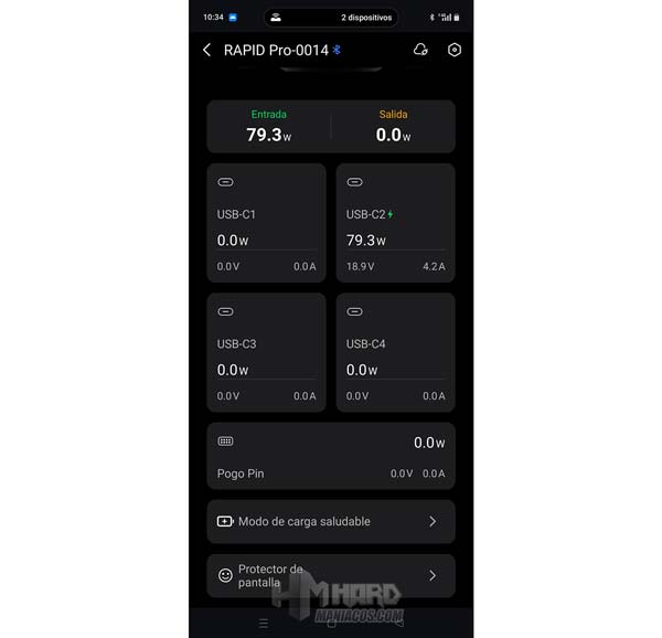 Por otro lado, en la recarga de varios dispositivos a la vez, vemos que se nos indica en la pantalla y en la app, la potencia de carga de cada uno de ellos.
