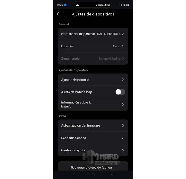 Como podemos ver en las opciones que tiene la app, esta nos permite configurar el nombre del dispositivo, el espacio en el que lo queremos incluir, ajustar la pantalla, activar alarmas de nivel de batería, información de esta o actualizar el firmware si fuera necesario.
