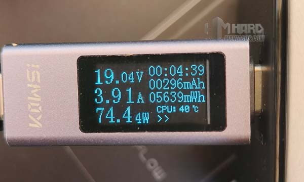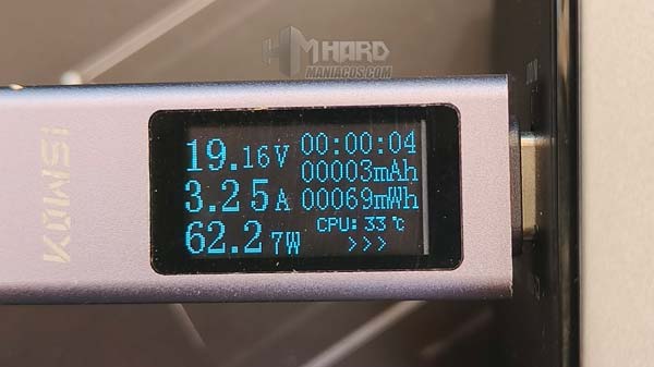 Al llegar al 0%, procedimos a recargar el RAPID Pro, con el cable EcoFlow RAPID Pro y un medidor de potencia, para verificar que la indicada sea real. Al iniciar dicha carga, en el Power bank, marcaba un 7%, con una potencia de 62W. Progresivamente, esta potencia fue subiendo hasta alcanzar los 74.4W, visualizándose también en la propia pantalla, así como el tiempo de carga restante.