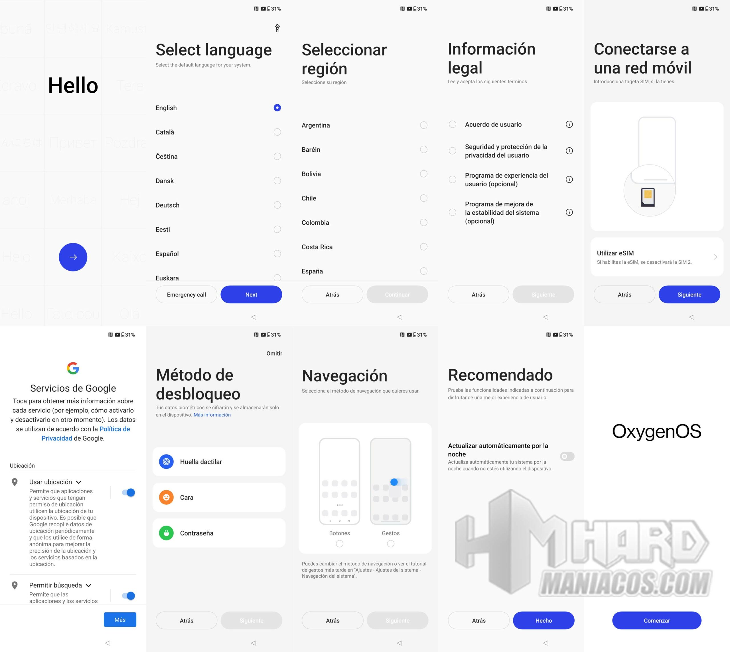 Encendemos el móvil y aparece el logo de OnePlus y Android debajo, seguido de unos circulitos rojos y blancos, luego nos da la bienvenida, escogemos el idioma y los primeros pasos de configuración, donde tenemos el modo de desbloqueo y el estilo de navegación (gestos o botones táctiles), entre otros.