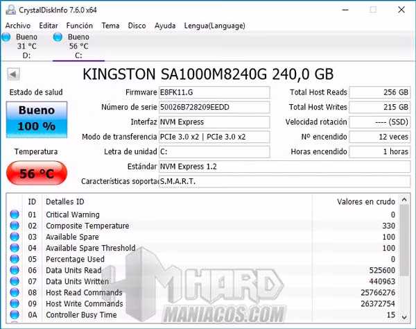 Para finalizar con las pruebas, usamos el software CrystalDiskInfo, que nos indica la temperatura del SSD Kingston NVMe A1000 de una forma bastante precisa. En un funcionamiento normal, como podemos comprobar en la siguiente imagen, está a unos 56ºC.