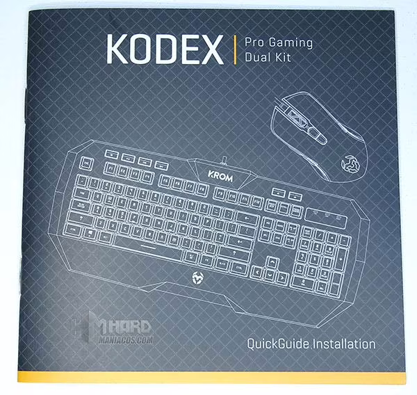 Comenzamos viendo el exterior de la caja, la cual es naranja y negra, con las letras de la marca Krom y del modelo de teclado KODEX, en blanco. En el frontal, podemos ver el teclado junto al ratón, ambos iluminados en naranja, además de una pequeña descripción del uso Gaming de este conjunto.