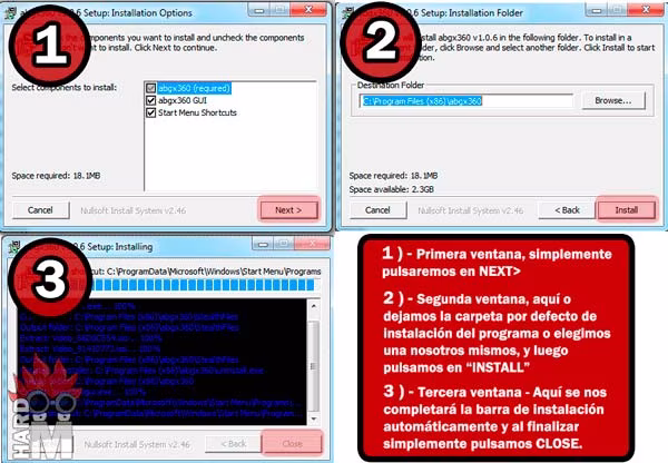 El primer paso que daremos con el ABGX 1.0.6 después de descargarlo, será instalarlo en nuestro PC. (Para esto supongo que no hace falta instrucciones pero por si acaso.) Ejecutamos el Archivo instalador que nos hemos descargado y nos saldrá una ventana en la que tendremos que dar en el botón de NEXT, y luego en INTALL y por ultimo a CLOSE. (Tal y como se puede apreciar en las imágenes, versión de Windows)